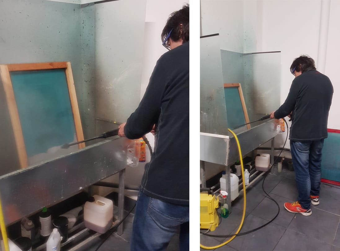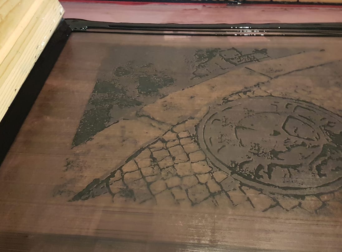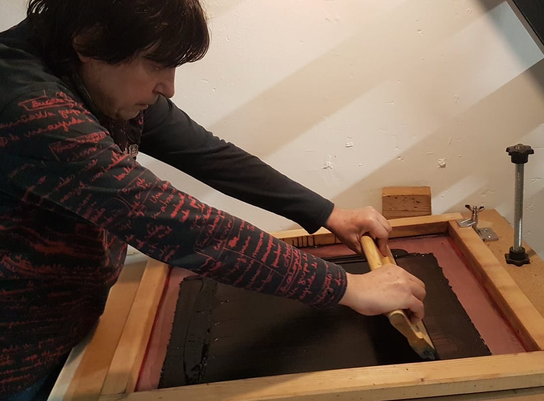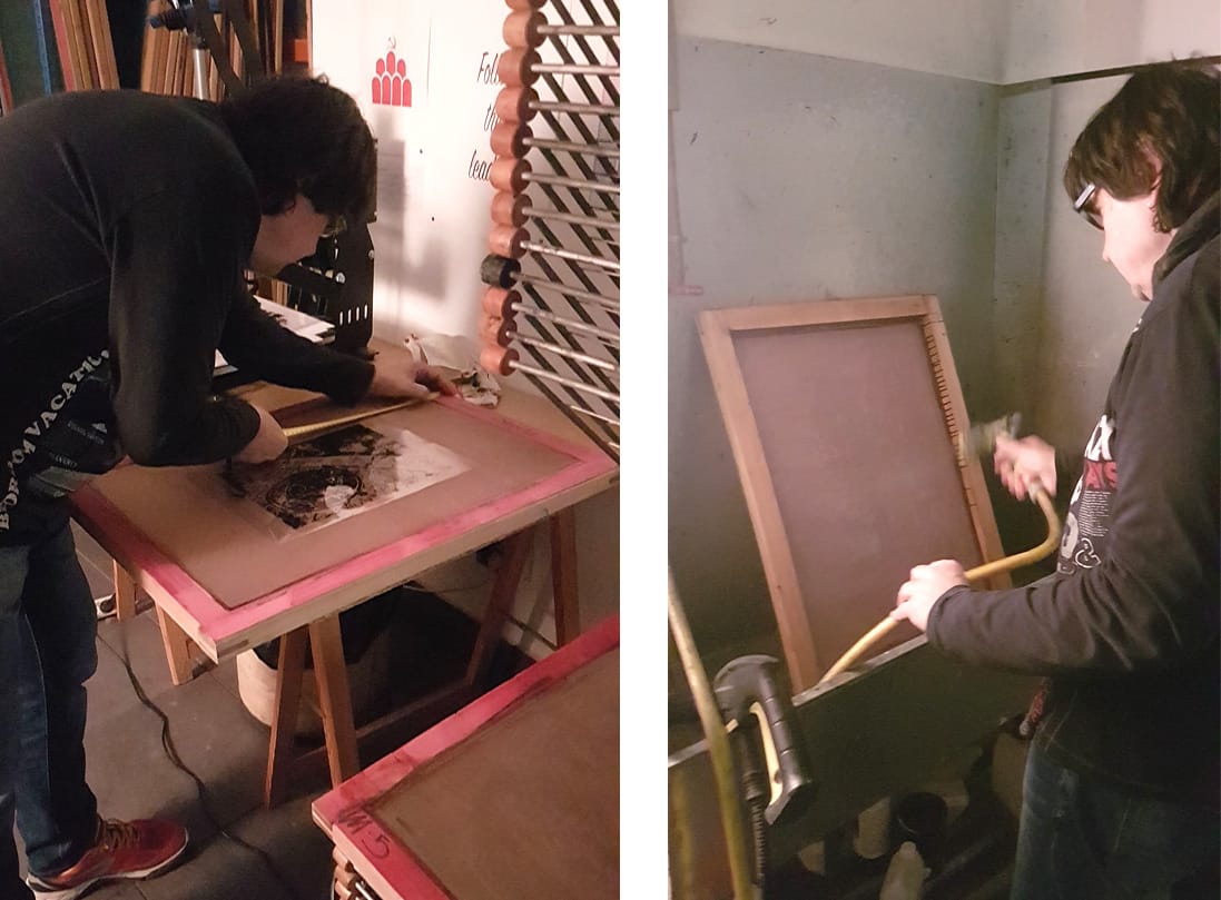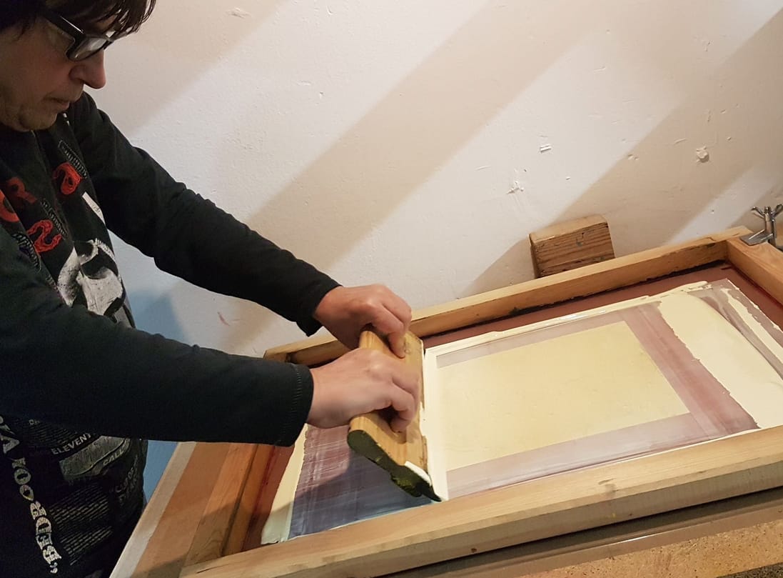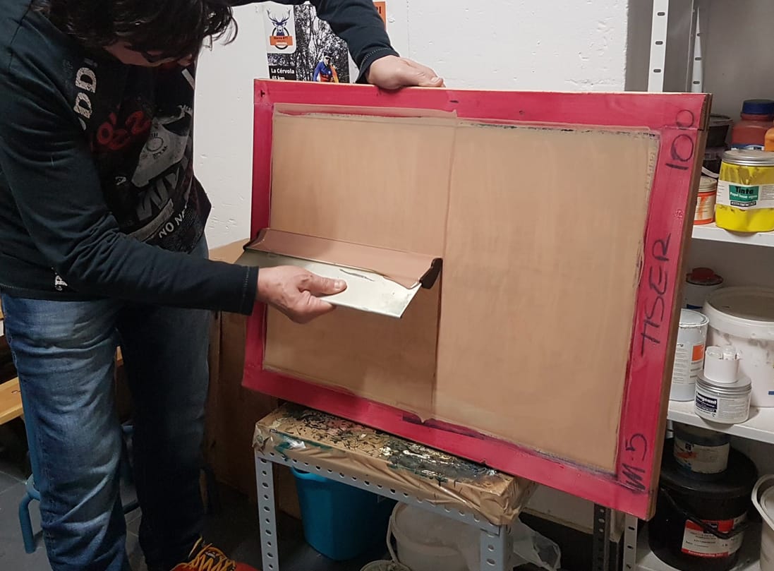 El segon dia ho vam dedicar a insolar pantalles, preparar les tintes i estampar. Vam començar a estirar l’emulsió sobre les pantalles que vam netejar el dia abans. Aquesta potser és la part més delicada de la serigrafia, si mai s’ha provat. Cal posar decisió, destresa i la justa dosi de pressió perquè la tinta de l’emulsió fotosensible, es disposi homogèniament sobre el teixit de la nostra pantalla de serigrafia.