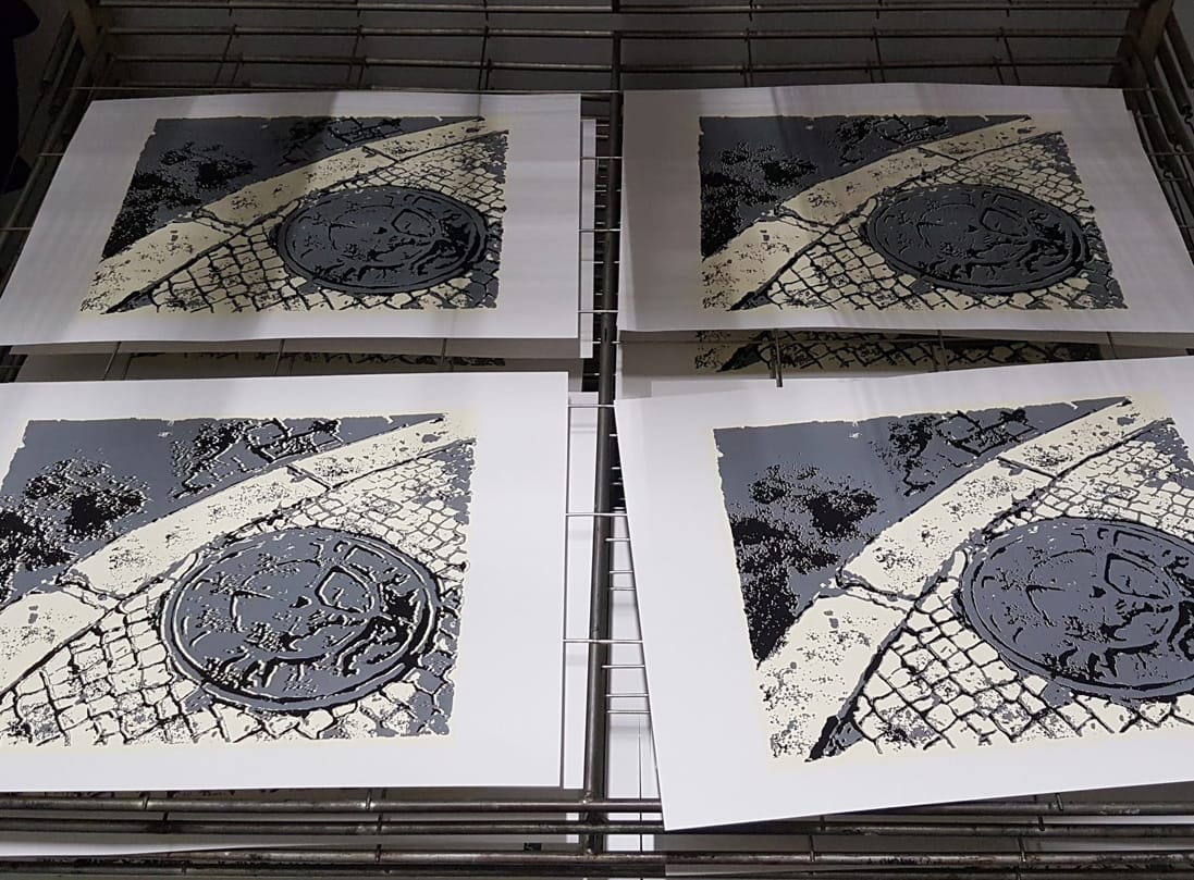 L’últim dia de taller vam avançar tan de pressa que vam acabar l’obra amb el tercer color que ens quedava per estampar, el negre, molt aviat. Depenent de l’obra, el negre és el color que confereix l’efecte de profunditat i ombrejat a la serigrafia, encara que aquesta sigui una tècnica d’estampació a tintes planes. Així que finalment vam realitzar unes 20 serigrafies de tirada limitada d’aquesta curiosa obra del Sebastià Farré, i vam aprofitar les últimes hores de curs per realitzar també una altra serigrafia a un color, treballant el fotolit de manera manual. Vam estampar aquesta vegada sobre roba, una samarreta verda i una bossa de color mostassa amb tinta tèxtil blanca. En tres tardes de curs, vam treballar amb les dues tècniques que utilitzem principalment, la serigrafia sobre paper i la serigrafia tèxtil.