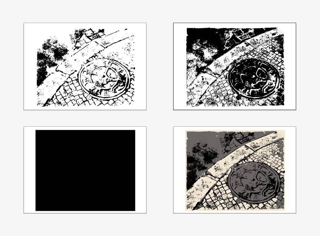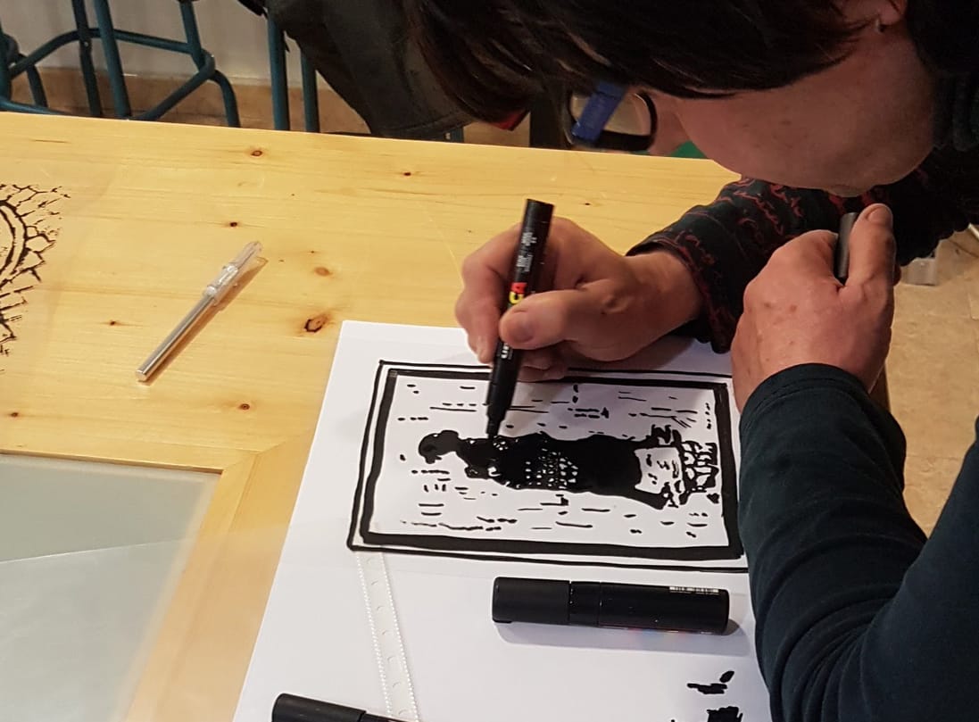 El primer dia sempre el dediquem a una mica de teoria per repassar els conceptes bàsics de la tècnica i a mostrar els espais de treball del nostre taller i a com utilitzar-los. També preparem el material, netegem les pantalles si cal, per a tenir-les a punt per insolar-les i dibuixem els fotolits manualment o digitalment. En aquest cas els vam preparar amb illustrator, senzillament vectoritzant l’obra original a partir d’una fotografia amb alta resolució. En la imatge següent podeu veure com va quedar l’obra vectoritzada i els tres fotolits negres, que ens van servir per a insolar les tres pantalles de serigrafia.