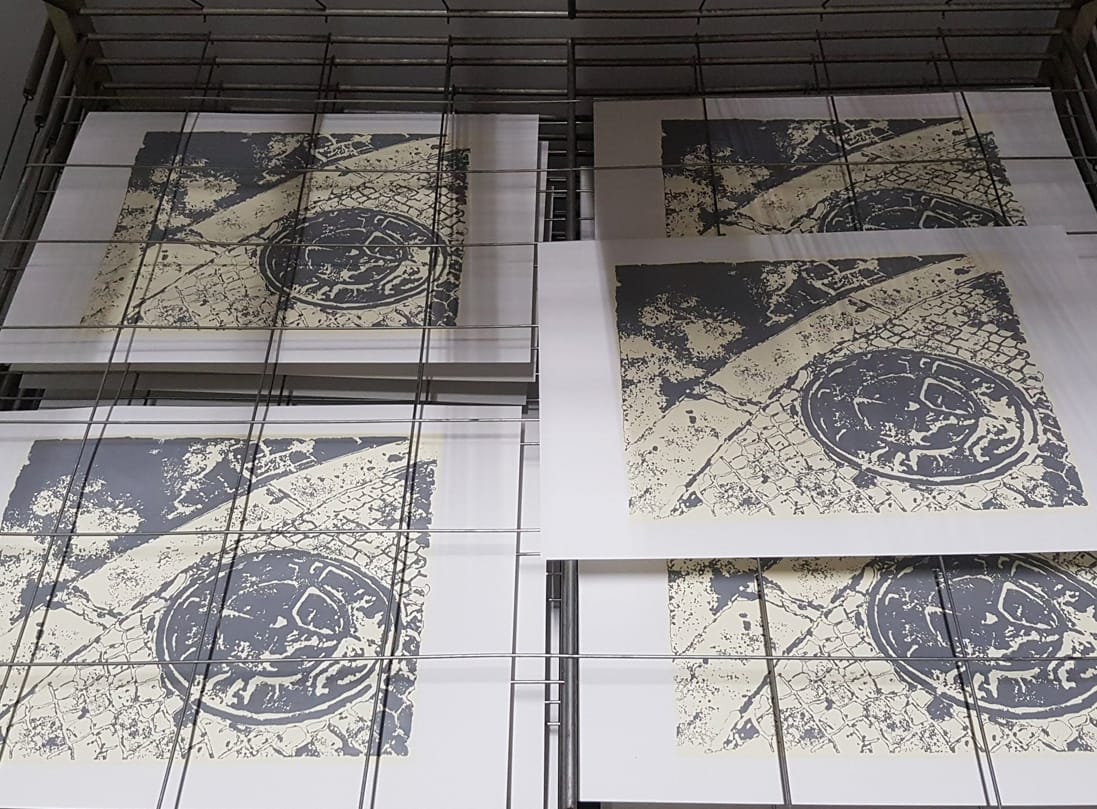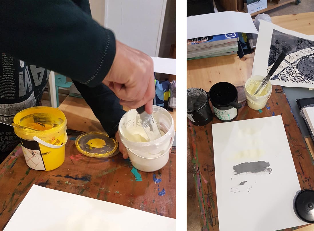 Cal esperar uns minuts per deixar assecar l’emulsió, així que de mentre vam preparar els colors amb tintes específiques per a serigrafia i per a estampar sobre paper. I finalment, després de tota la feina preparatòria i molt necessària per a la serigrafia, vam començar a estampar. Aquella tarda vam poder estampar el primer color de la serigrafia, un blanc trencat tipus crema i el gris.